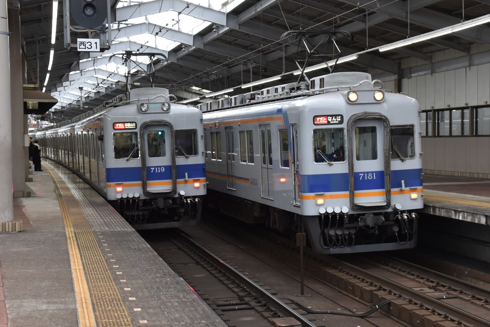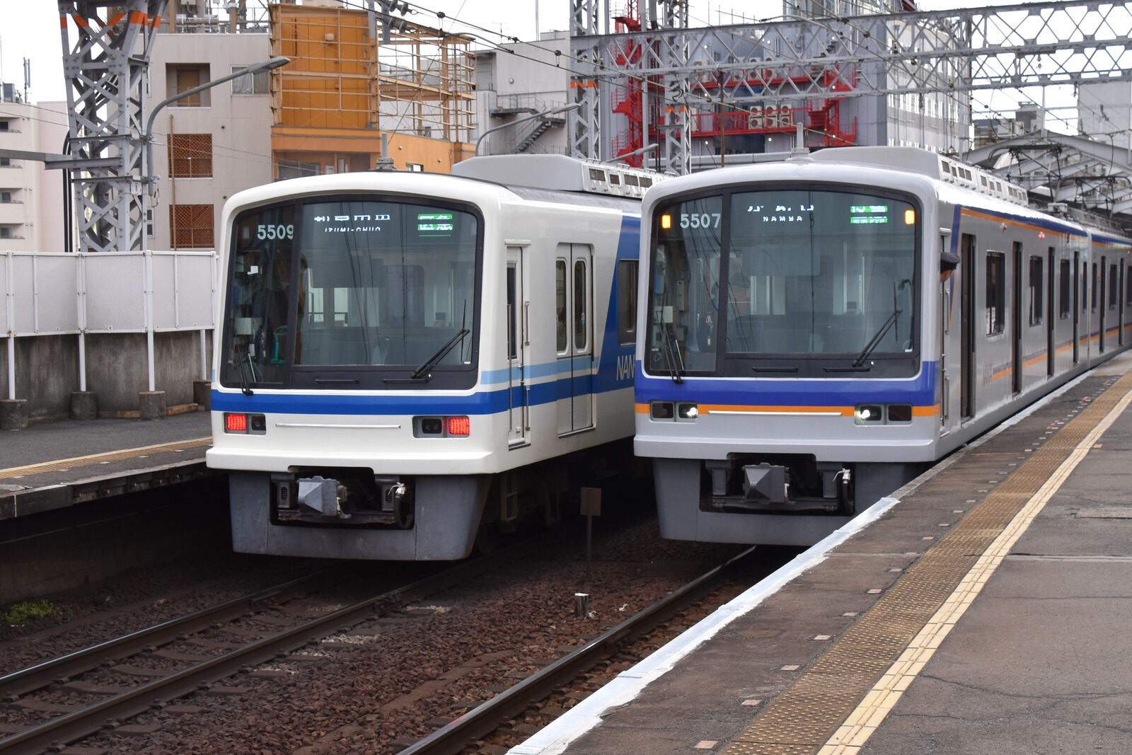 (写真)泉北色(左)と南海色(右)の5000系 新今宮にて